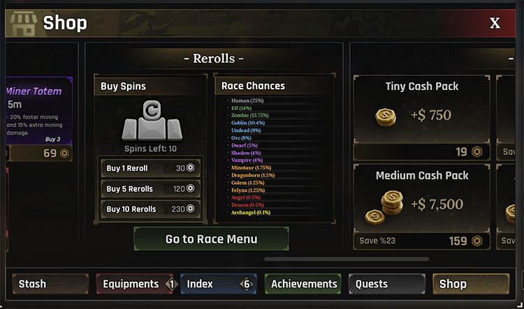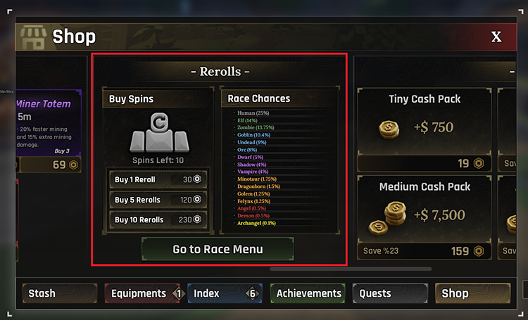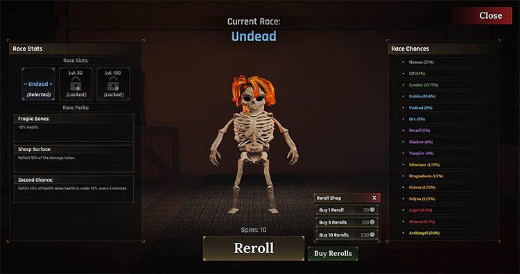 Bấm Reroll để bắt đầu reroll tộc, hiện tại có 16 tộc với những khả năng khác nhau. Tộc càng mạnh thì càng hiếm và cần phải rất may mắn mới reroll được.