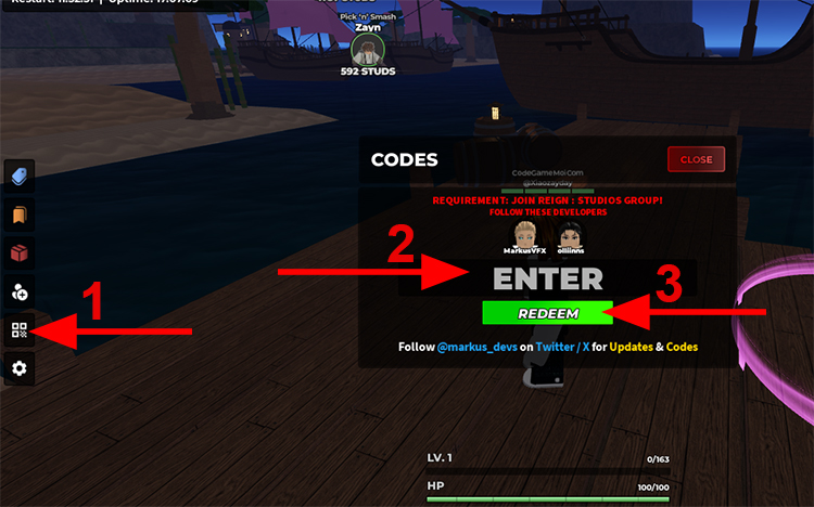 Để có thể nhập code Enchanted bạn cần tham gia nhóm Reign: Studios trên Roblox. Sau khi hoàn tất, hãy làm theo các bước sau: