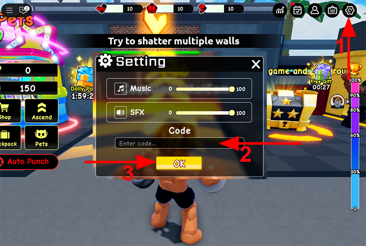 Nhập code Punch Wall thực sự rất đơn giản với các bước đơn giản sau đây: