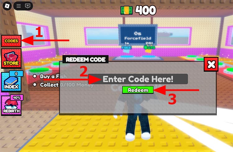 Để nhập mã code trong Steal A Fish và hốt quà xịn, làm theo các bước sau:
